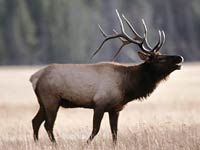 Bull elk are easily identified by their large antlers and dark shaggy mane as well as the bugling sound they make. All elk have a light colored rump as the name wapiti suggests.