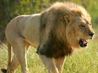Mature male lions are unique among the cat species for the thick mane of brown or black hair encircling the head and neck. Both male and female lions roar, a sound which can be heard as far as 8 km away.