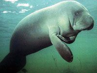 The manatee, often called the sea cow, is the only exclusively herbivorous marine mammal. It grazes on all kinds of aquatic plants, especially marine sea grasses, assisted by its large prehensile lips, which are studded with bristles.